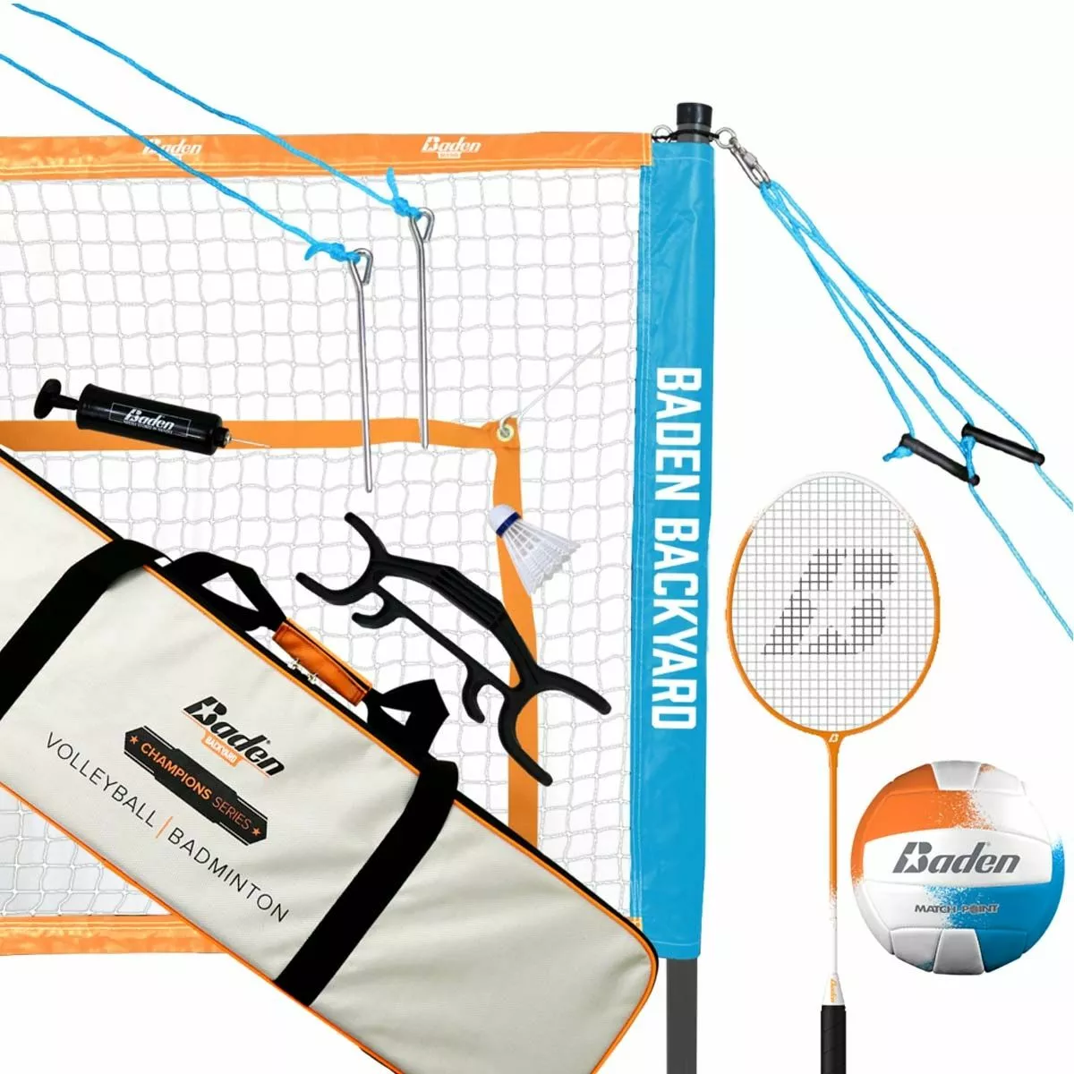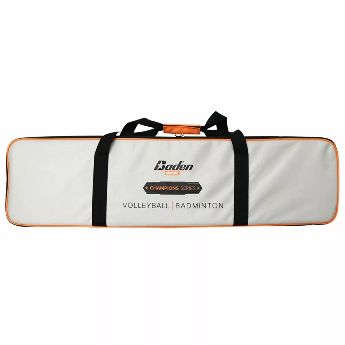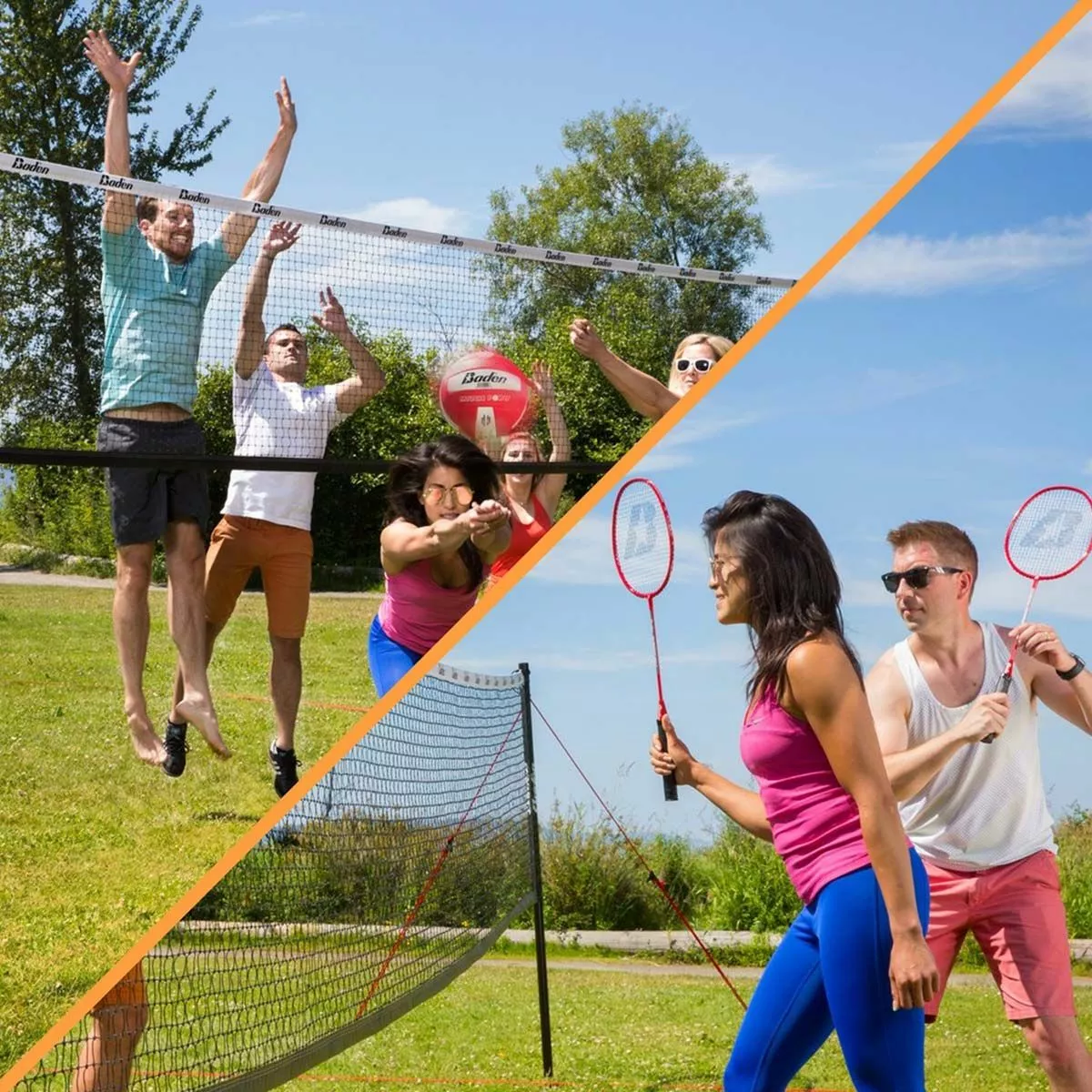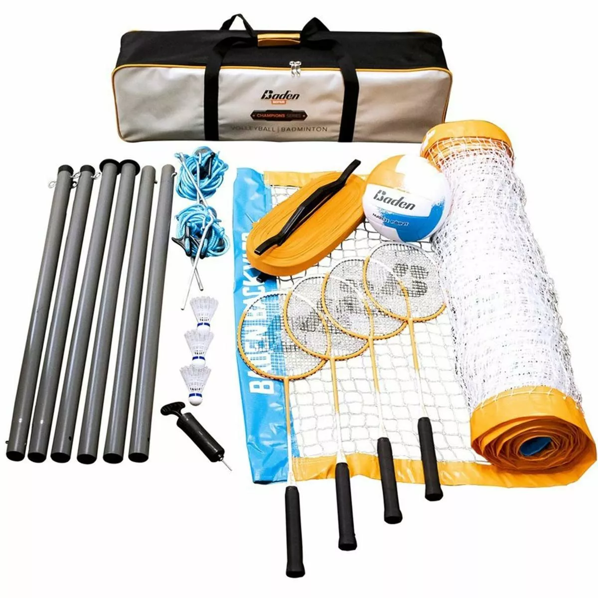 The Baden Champions Volleyball/Badminton set allows you to quickly setup and transition from volleyball to badminton for the ultimate in backyard games versatility. This set includes a regulation size nylon volleyball and badminton net, poles, stakes, a high-quality Baden volleyball, 4 badminton racquets, 3 shuttlecocks, boundary lines, and a carrying case. Adjustable steel poles allow for easy set-up and seamless transition between game types. This high-quality, long-lasting set will endure the elements. And its heavy duty powder coated steel poles, waterproof edges, and durable nylon rope are strong enough to withstand any level of competition. This 2-in-1 game set fits perfectly into its durable weather-resistant carry bag for easy storage and transportation.