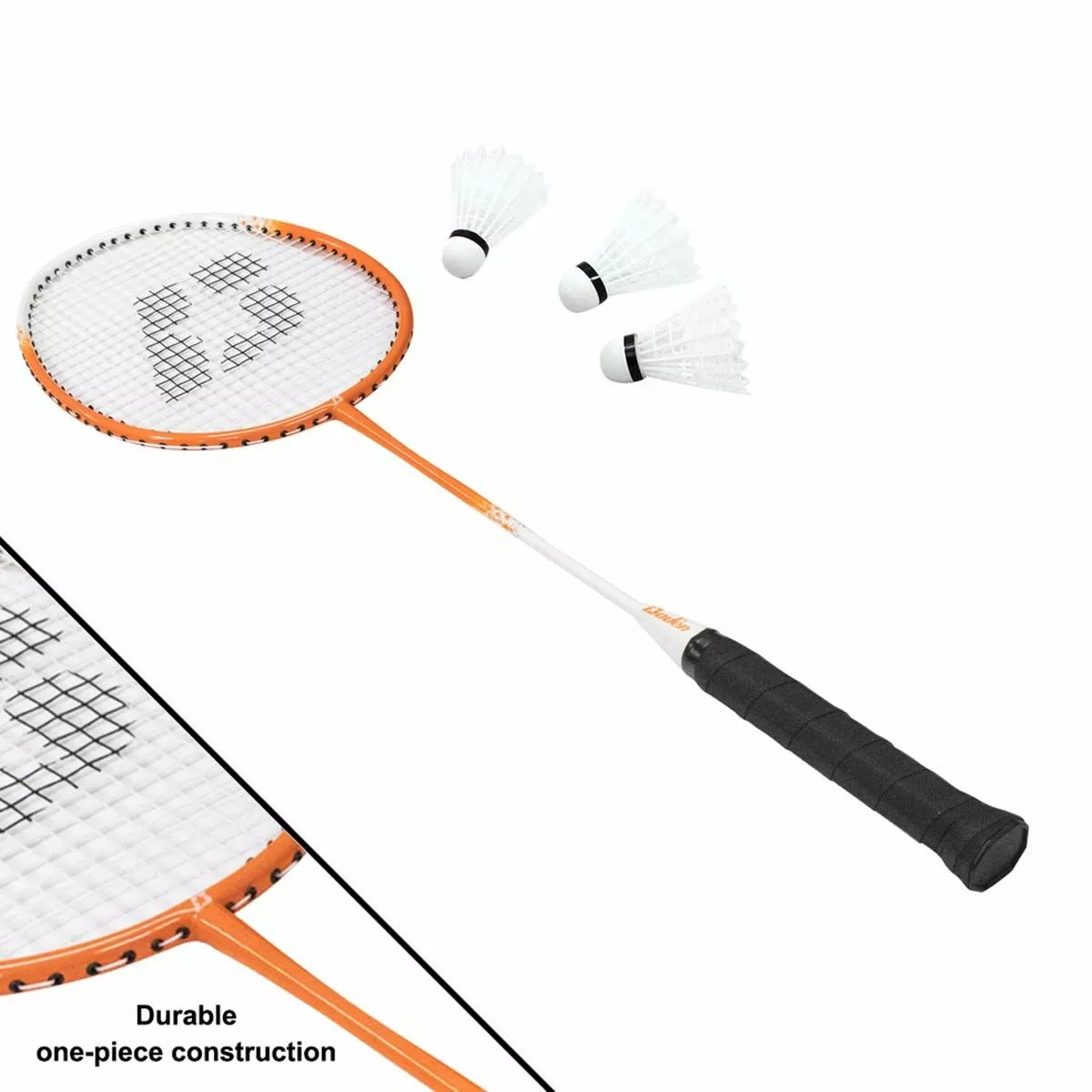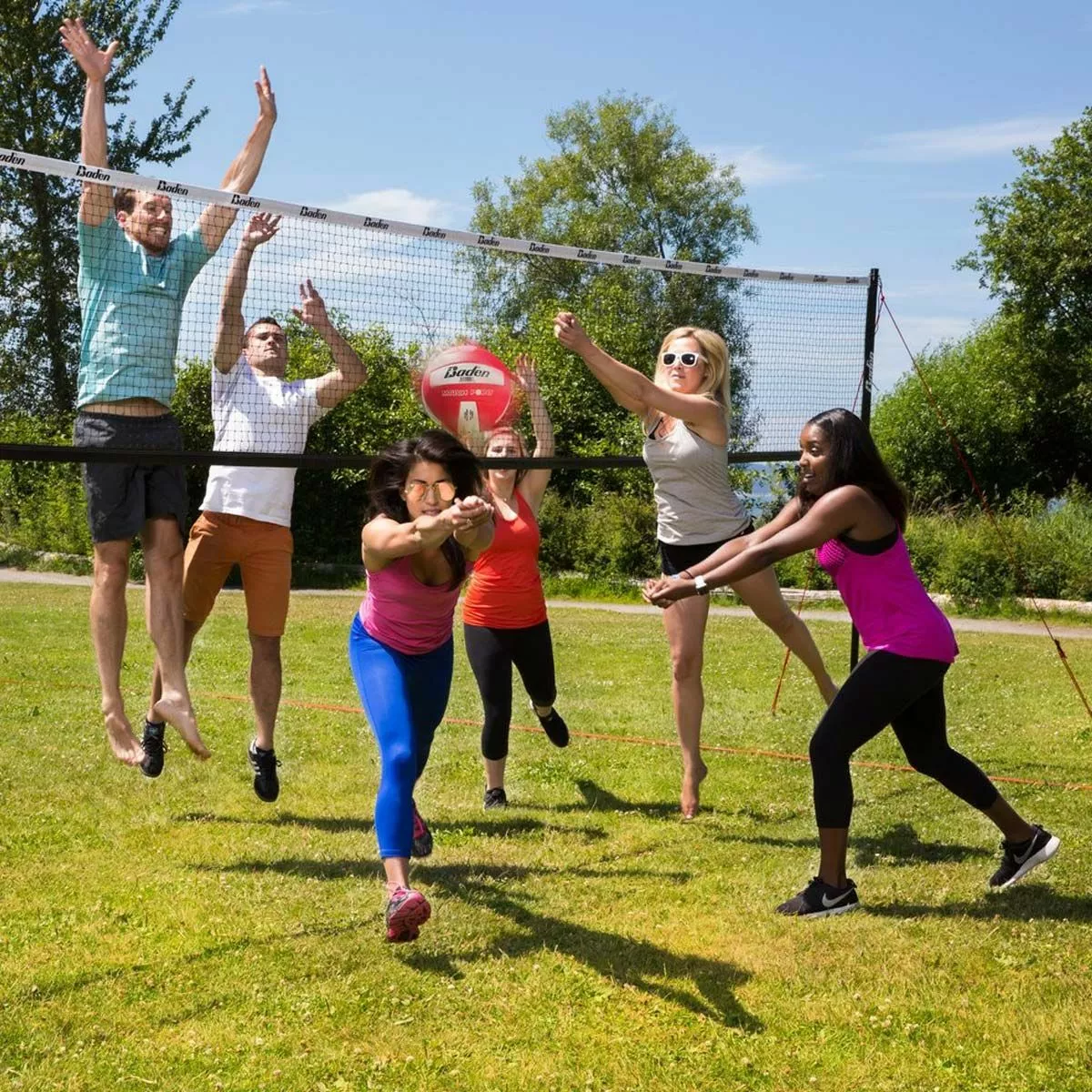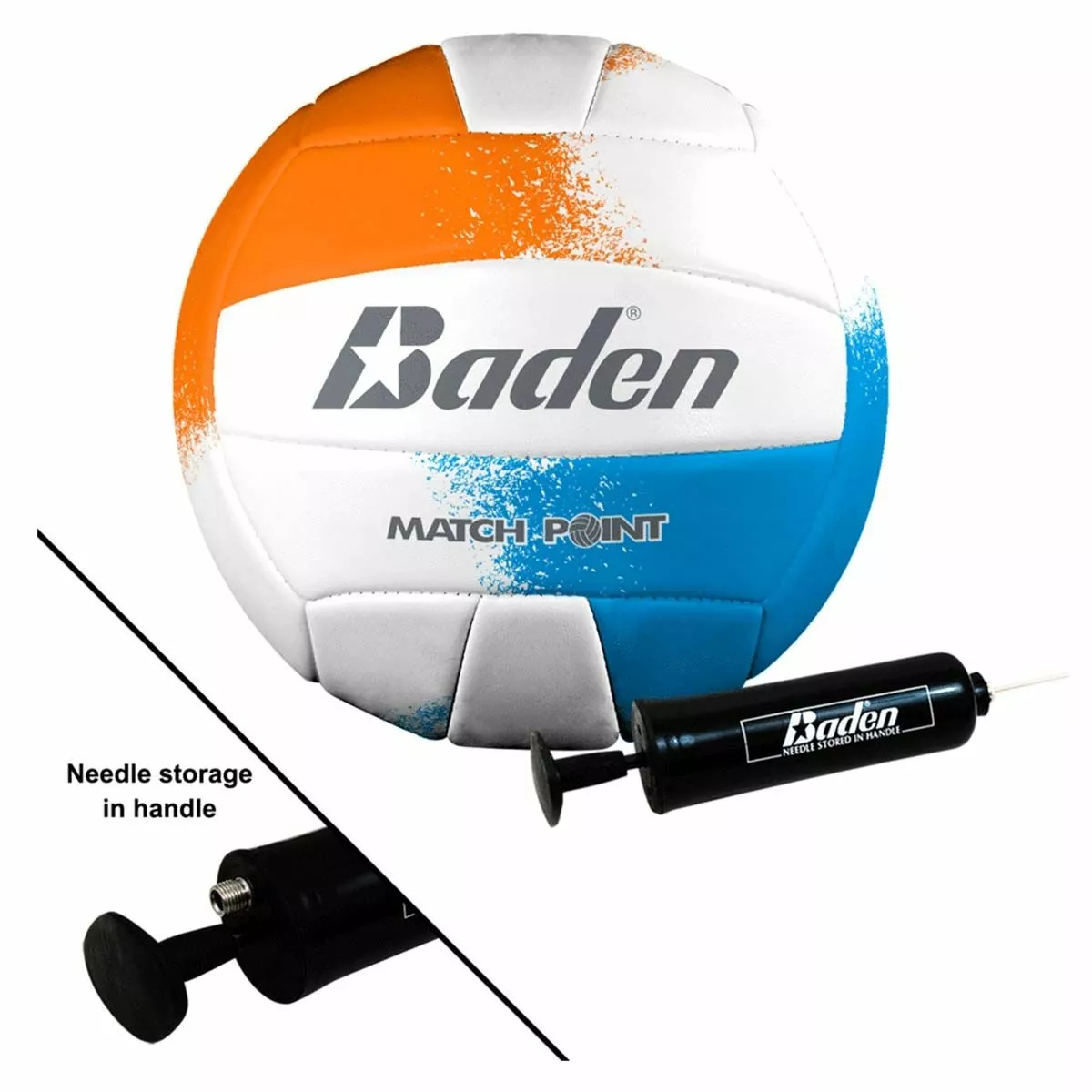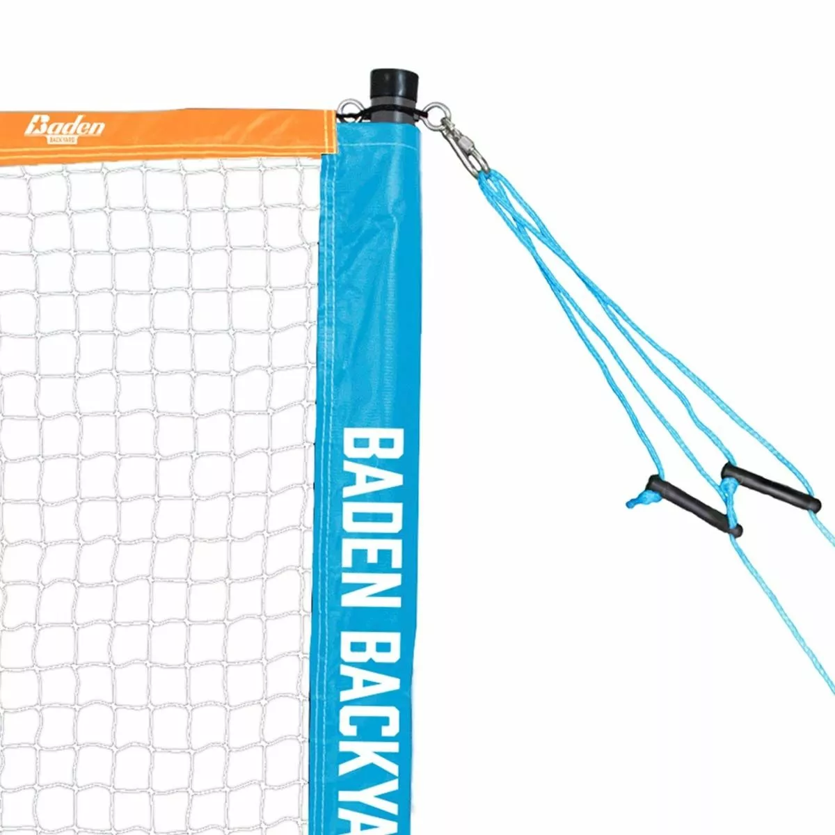 The Baden Champions Volleyball/Badminton set allows you to quickly setup and transition from volleyball to badminton for the ultimate in backyard games versatility. This set includes a regulation size nylon volleyball and badminton net, poles, stakes, a high-quality Baden volleyball, 4 badminton racquets, 3 shuttlecocks, boundary lines, and a carrying case. Adjustable steel poles allow for easy set-up and seamless transition between game types. This high-quality, long-lasting set will endure the elements. And its heavy duty powder coated steel poles, waterproof edges, and durable nylon rope are strong enough to withstand any level of competition. This 2-in-1 game set fits perfectly into its durable weather-resistant carry bag for easy storage and transportation.