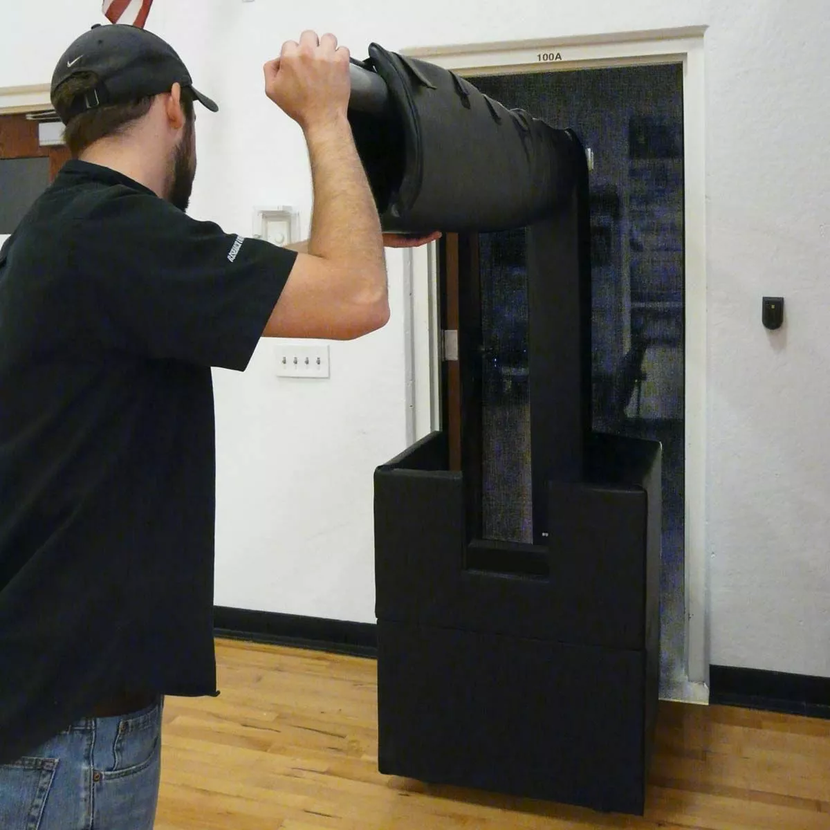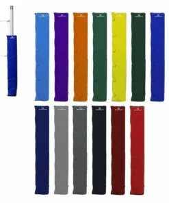 The Bison QwickCourt Centerline portable volleyball net system is the ideal recreational system when floor sleeves or anchors are not possible or desired: The portable net system includes 3″OD aluminum uprights that have spring-assisted telescoping uprights, portable end bases with padding and wheels, net tensioning winch, competition net with cable covers and antennas with boundary tapes. Counterweight is provided by 36 cement blocks (18 per side) that supply 425lbs of ballast. This volleyball net system is perfect for facilities where floor sockets are impractical or impossible. For more information about free lettering, contact Anthem Sports.