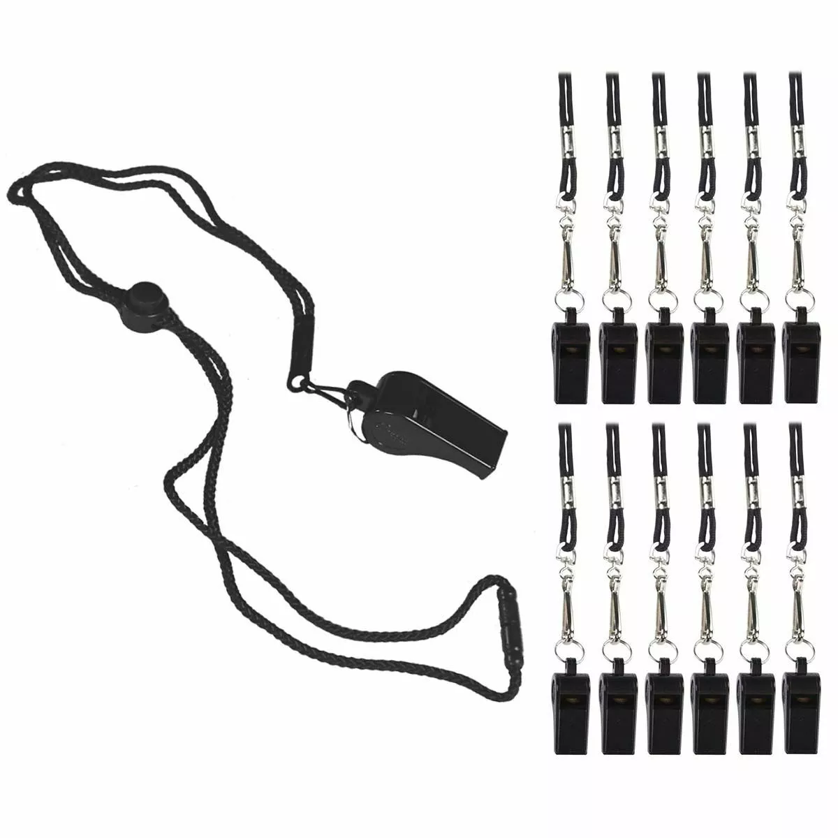 These medium-weight, multi-purpose plastic whistles include a black lanyard that keeps them ready at all times.Â