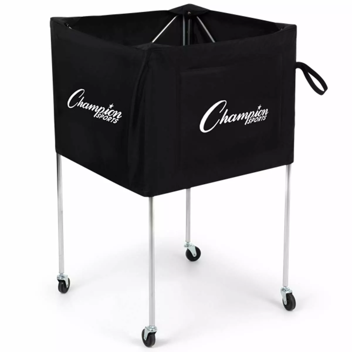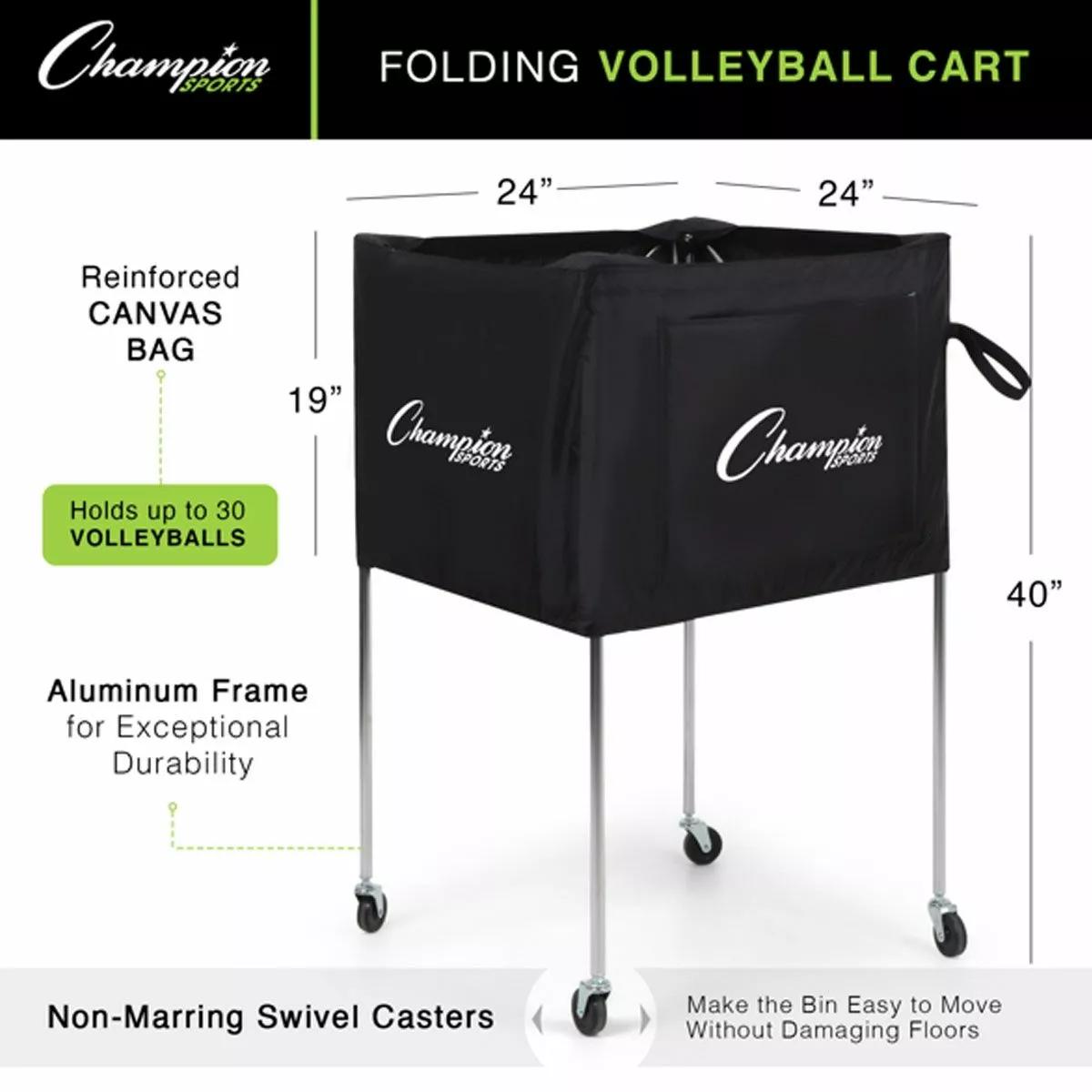 This folding volleyball cart features a durable black nylon basket and sturdy aluminum frame. The cart’s large capacity holds 30 inflated volleyballs and folds for easy transport and storage. Non-marring swivel caster wheels allow for smooth movement around the gym floor.