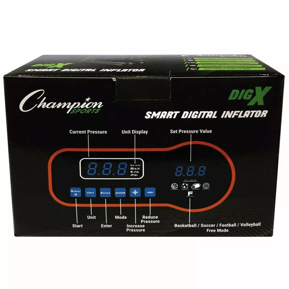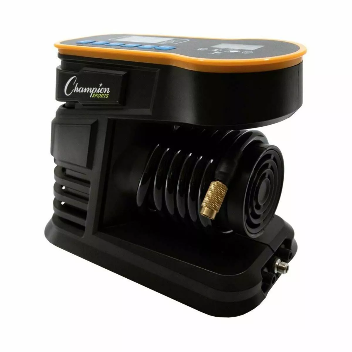 The smart digital electric inflator from Champion is a high-quality and intelligent pump designed for inflating every type of ball. Powerful, compact, and built to last, this smart inflator weighs only 2 pounds, making it easy to transport. This digital ball pump includes 3 inflation needle tips that are compatible with all ball types. The LED gauge allows for setting and adjusting the appropriate pressure based on the ball that is being inflated. Multiple preset settings make for quick and effective inflation with its unique basketball, soccer, football, volleyball, and free modes. The auto-stop feature stops pumping air as soon as the pressure in the ball reaches the value set by the operator. Automatic motor speed adjustment and 24 hour continuous operation let you inflate countless balls for extended periods at a time without worrying about a decrease in pressure. The maximum working pressure is 30 PSI and maximum flow rate is 22 LPM/.78 CFM. 4 suction cup feet on the bottom of the inflator ensure stability during each pump.