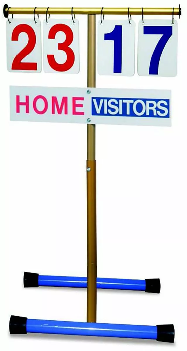 This versatile manual scoreboard can be used on the floor or table for a variety of sports.