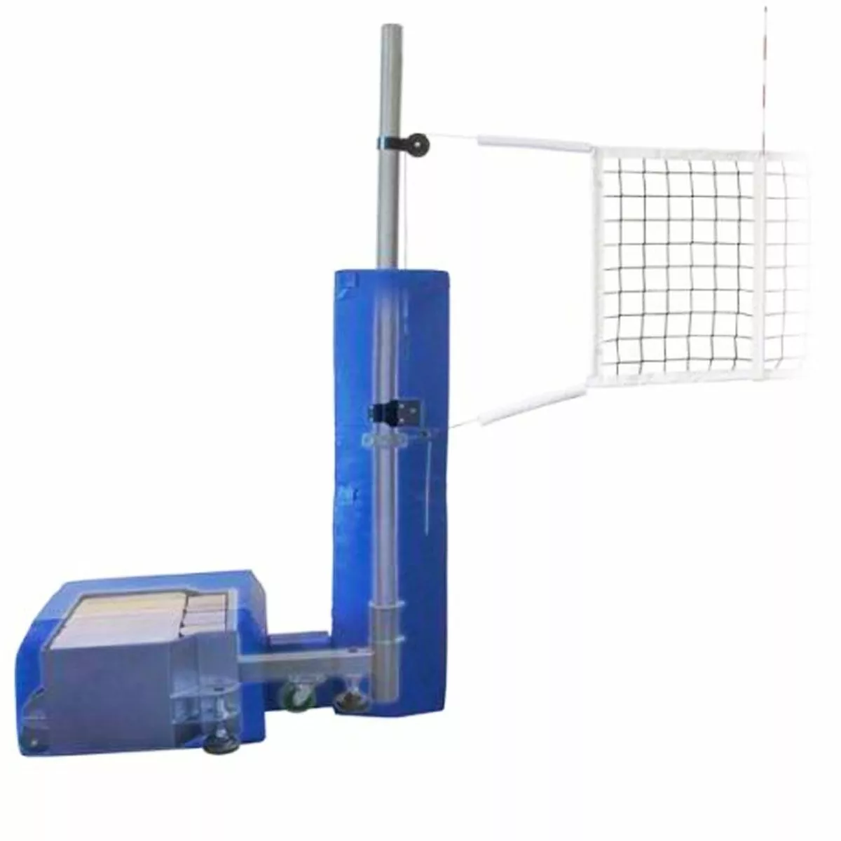 The First Team PortaCourt Stellar Portable volleyball net system does not require the use of floor anchors or floor sleeves. This completely portable volleyball net system includes a top quality Kevlar competition volleyball net, antennas, rope covers, uprights, post pads and base pads. The PortaCourt sport bases provide the perfect combination of game quality net tension and easy transport for budget conscious facilities. The portable volleyball sets are perfect for facilities where floor sockets are impossible or not desired. Each PortaCourt base is designed to receive (19) 4″x8″x16″ solid cement blocks (570 lbs), available at any builder’s supply center. Slide the Stellar volleyball post into the post receiver sleeve that is welded to the front of the portable base. Using a 3/4″ socket wrench lower all three protective foot-pads to the floor. The net height can be set to men’s, women’s or junior heights when you’re ready to play. The system also includes a safety padding to cover ballast box, neck and volleyball post. The base units can be transported by one adult with no need to remove ballast blocks. For free pad lettering available, contact Anthem Sports.