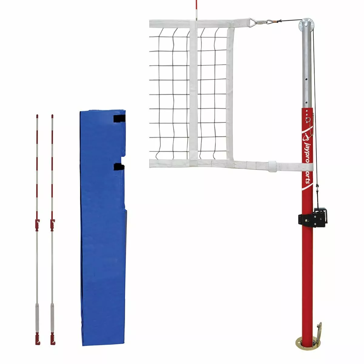 The Jaypro 3″ Hybrid Steel PVB-3000 volleyball net system is an affordable, high performance system designed for international, collegiate and high school play. The 3″ OD uprights feature a hybrid design with a steel bottom for strength and an aluminum top for reduced weight. The uprights are equipped with a 16 pin-stop height adjustment that ranges from 6’6″ to 8’2″ and accommodates men’s, women’s, junior men’s, and junior women’s net heights. The 3″ diameter uprights can be used with 3-1/2″ diameter floor sleeves via a separately sold adapter (adapter reduces 3-1/2″ to 3″). The heavier weight of the steel uprights makes the Hybrid Steel PVB-3000 best suited for programs that don’t need to break down the system often. The Hybrid Steel’s Flex Net is easy to set up and provides great net tension with very little flex for lively net play. The PVB-3000 ships complete with antennae and upright padding.