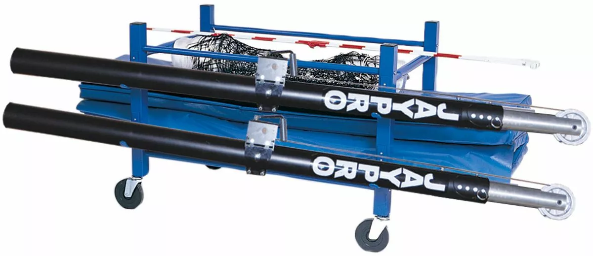 This sturdy volleyball equipment carrier has welded side frames and heavy duty, non-marring casters that will not harm your gym floor. The carrier holds four standards nets, pads & more!