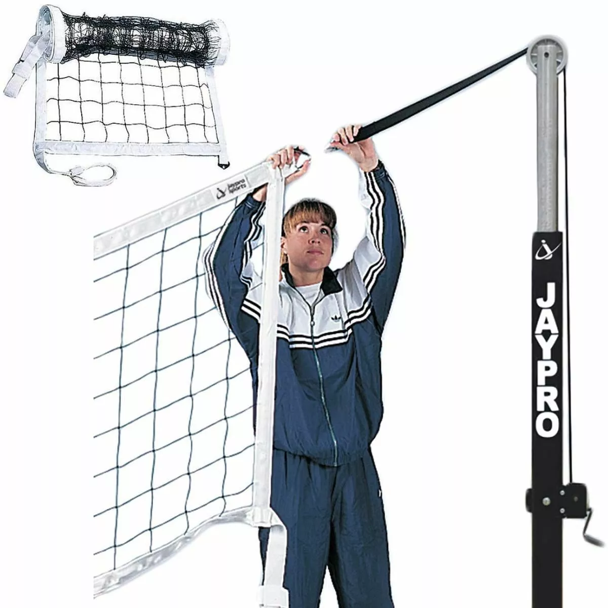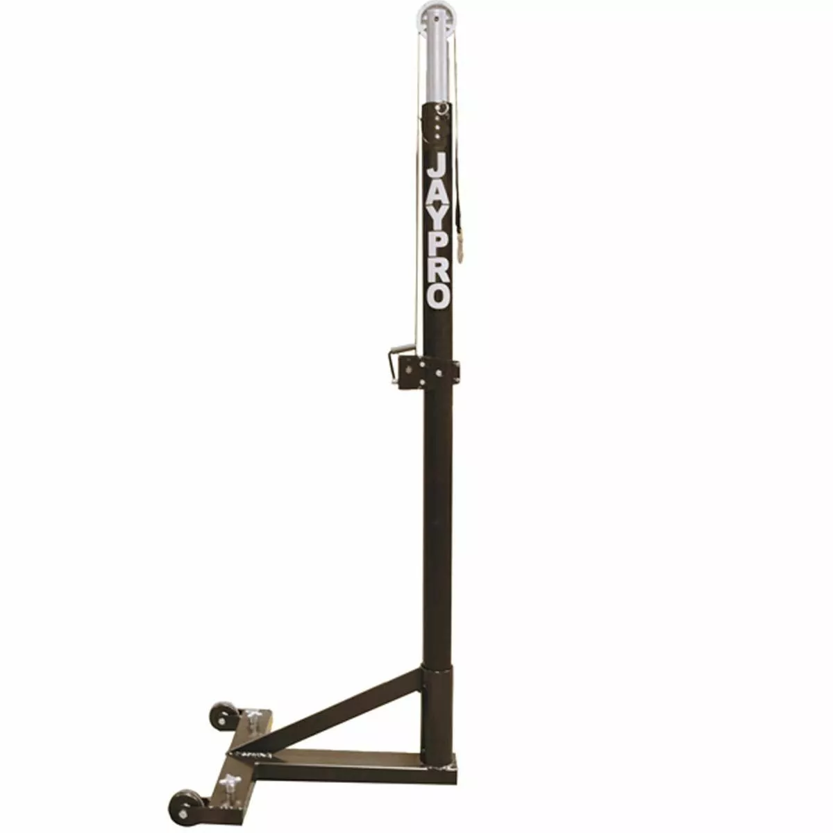 The Jaypro PVB-2500 second floor volleyball net system is designed for use where floor sleeves are impractical. Floor anchors (4 required) are used instead of floor sleeves. The strong base design and world class uprights provide top level performance without the use of cables or wires. These aluminum uprights feature pin stop height adjustment which ranges from 6’6″ to 8’2″. The base hand knobs secure the steel T-base to anchors in the floor for safety and security. The worm drive winch provides smooth and easy net tensioning.