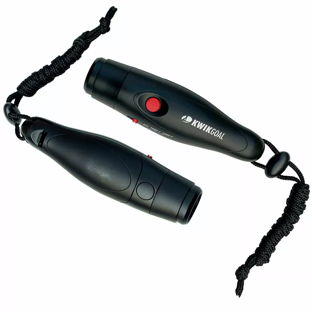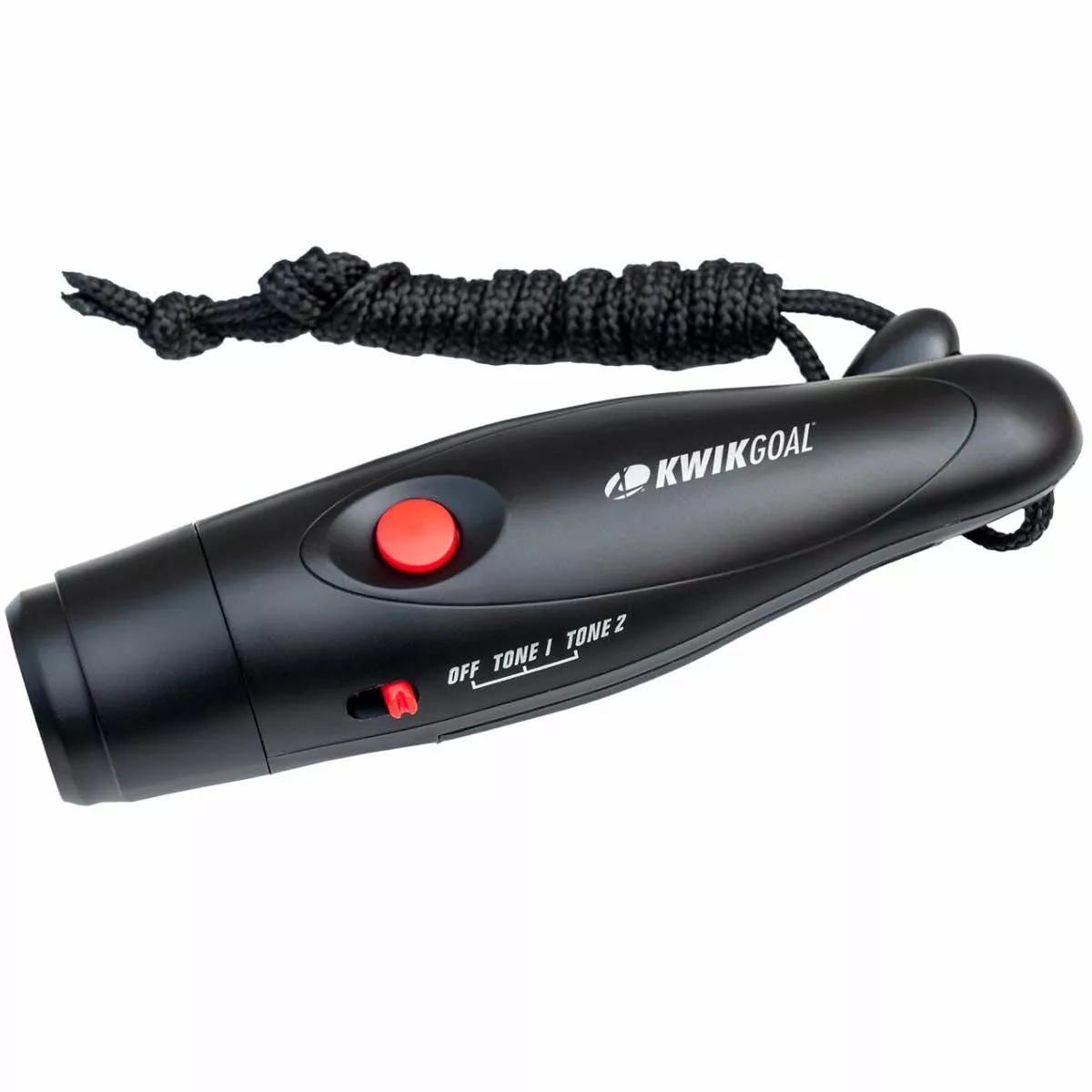 The Kwik Goal 2-Tone Electronic Whistle provides a sanitary alternative to the standard whistle, offering two loud and distinct whistle tones with the press of a button. The two 125 dB tones make the signal easily distinguishable between fields and courts, eliminating confusion among players. Batteries and lanyard included.