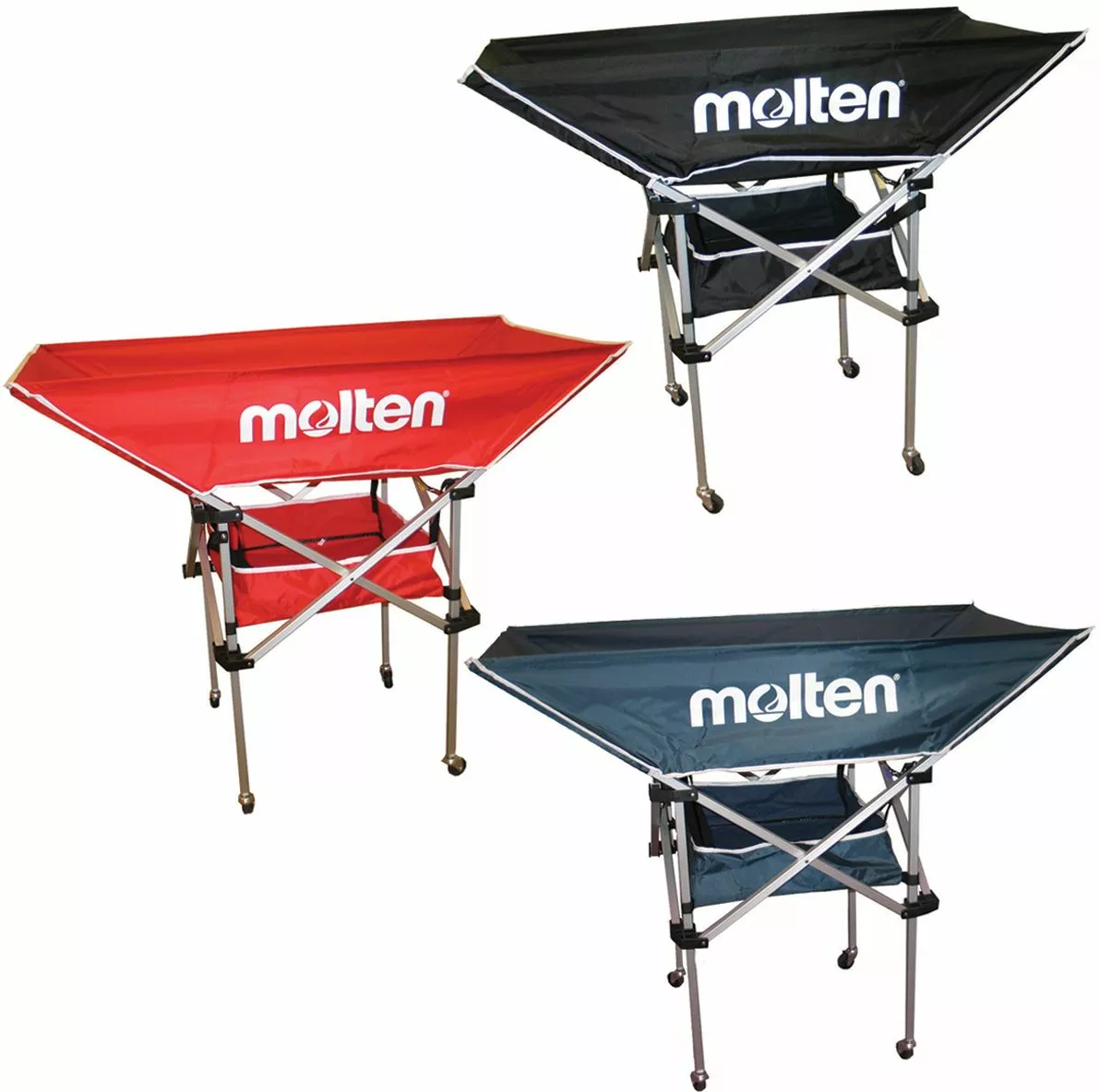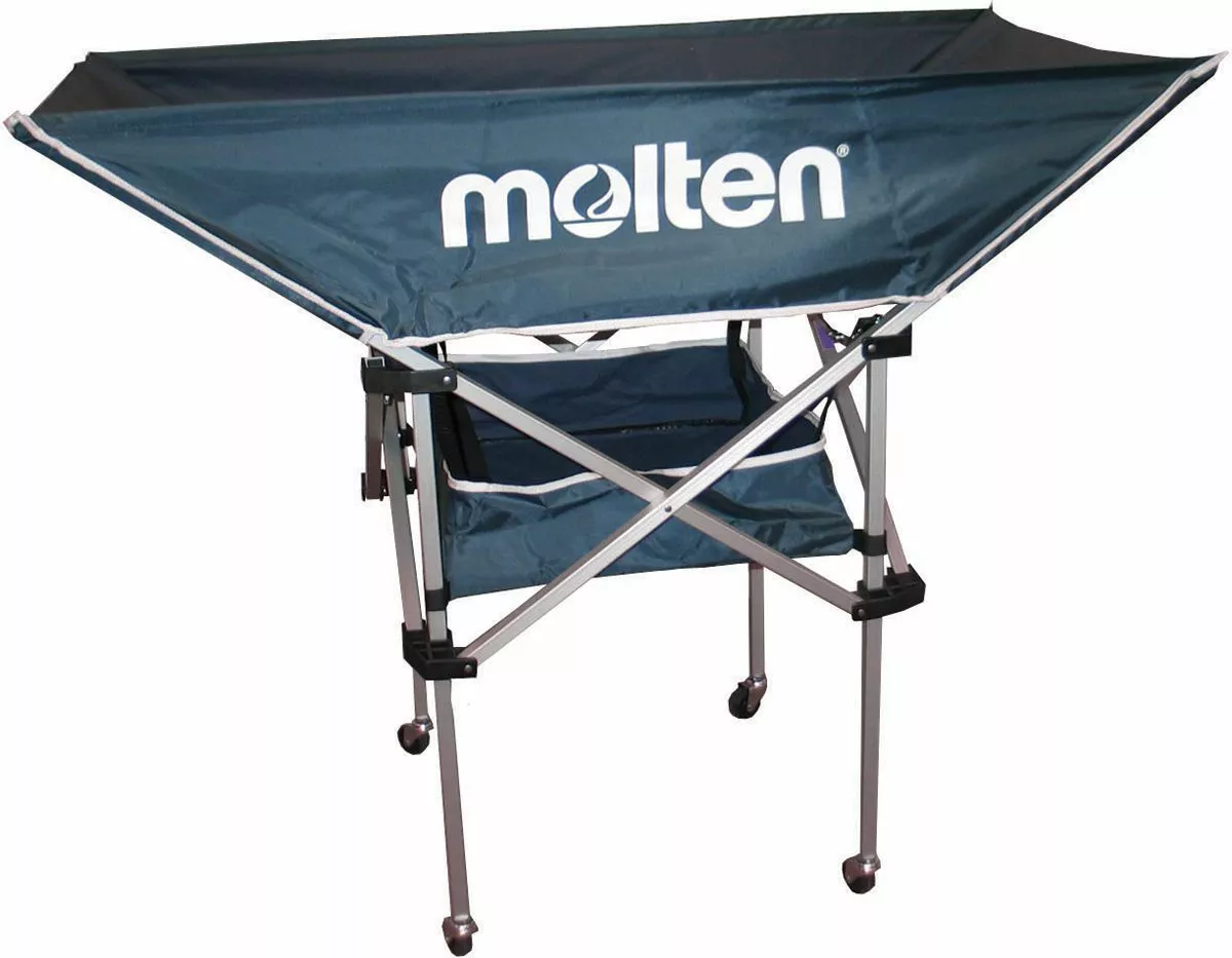 This Molten ball cart makes practice a breeze with its high profile design for fast ball distribution. High quality nylon and aluminum construction makes this cart more durable than similar carts from other manufacturers. The sturdy caster wheels make it easy to roll around the gym floor and the cart folds for easy transport and storage. The convenient lower compartment provides a place to store additional coaching items such as hand pumps and clipboards.Â