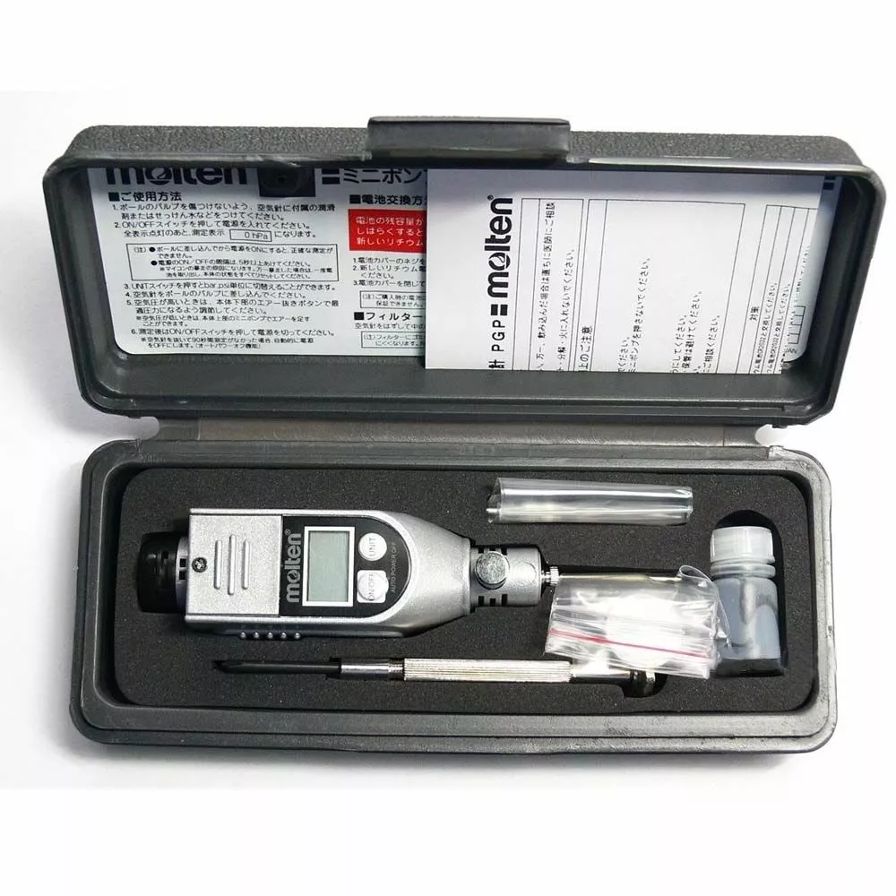The Molten PGP digital pressure gauge is an all-in-one digital air pressure gauge with a built-in ball pump. This gauge and pump is ideal for referees and coaches looking for an accurate, compact, lightweight measurement device. It comes in a hard, plastic protective case that easily stores in your travel bag. The built-in pump and relief valve allow for an easy air pressure adjustment whenever it’s needed. Simply insert the gauge into the ball to read the air pressure in either hPa, bars, or psi units. Add air pressure with the built-in handle that pumps like a traditional handheld pump. Release air pressure via the relief valve button. This gauge also includes an extra inflation needle, needle lubricant, a lithium battery, and a small screwdriver to replace the battery.