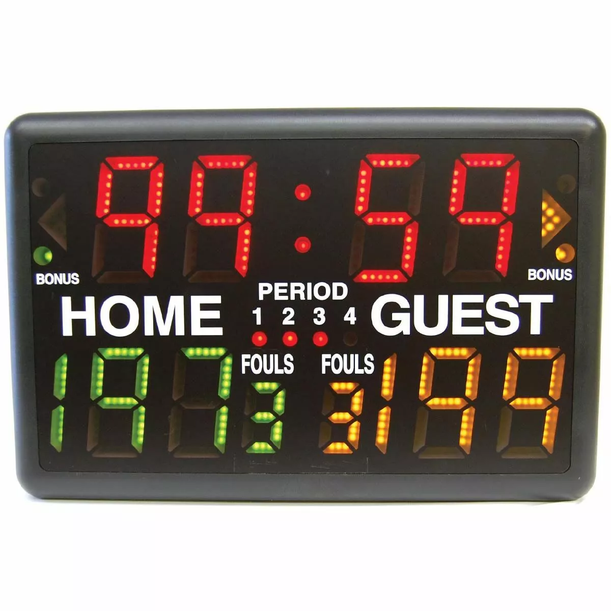 The multi-sport tabletop scoreboard makes keeping score simple and easy! This portable tabletop scoreboard can be used in basketball, volleyball and wrestling. The multi-sport tabletop scoreboard features a clock, stopwatch and timer program with alarm, and bonus, period and foul indicators. A stand is available for purchase separately (see A91-189 below). This scoreboard has a built-in carry handle for easy transport. Now includes free wireless remote!