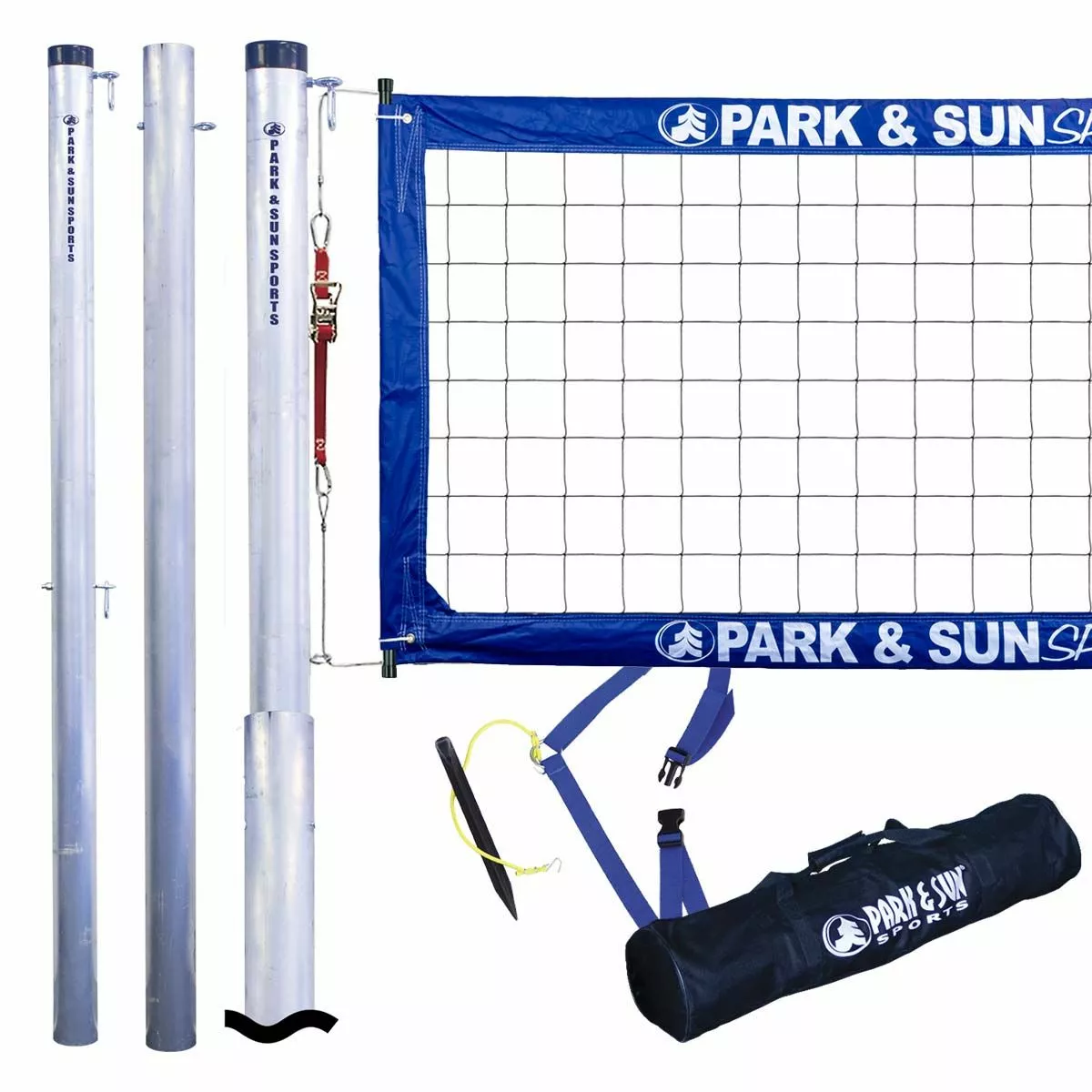 The Park & Sun 4000T tournament volleyball net system is designed for competitive outdoor use. The 4000T volleyball net system is a comprehensive kit that includes all you need to set up a permanent grass or sand court. Order with the optional ground sleeves (below) for a semi-permanent installation. This professional, tournament-grade volleyball kit comes with aluminum poles with zinc-plated hardware, durable enough to combat the elements. The telescoping poles can be adjusted to two playing heights of 8′ and 7’4″. The 32′ x 39″ regulation net comes with side dowels & a lever ratchet to keep the net secure. The included pre-measured boundary is easy to set up on grass or sand.