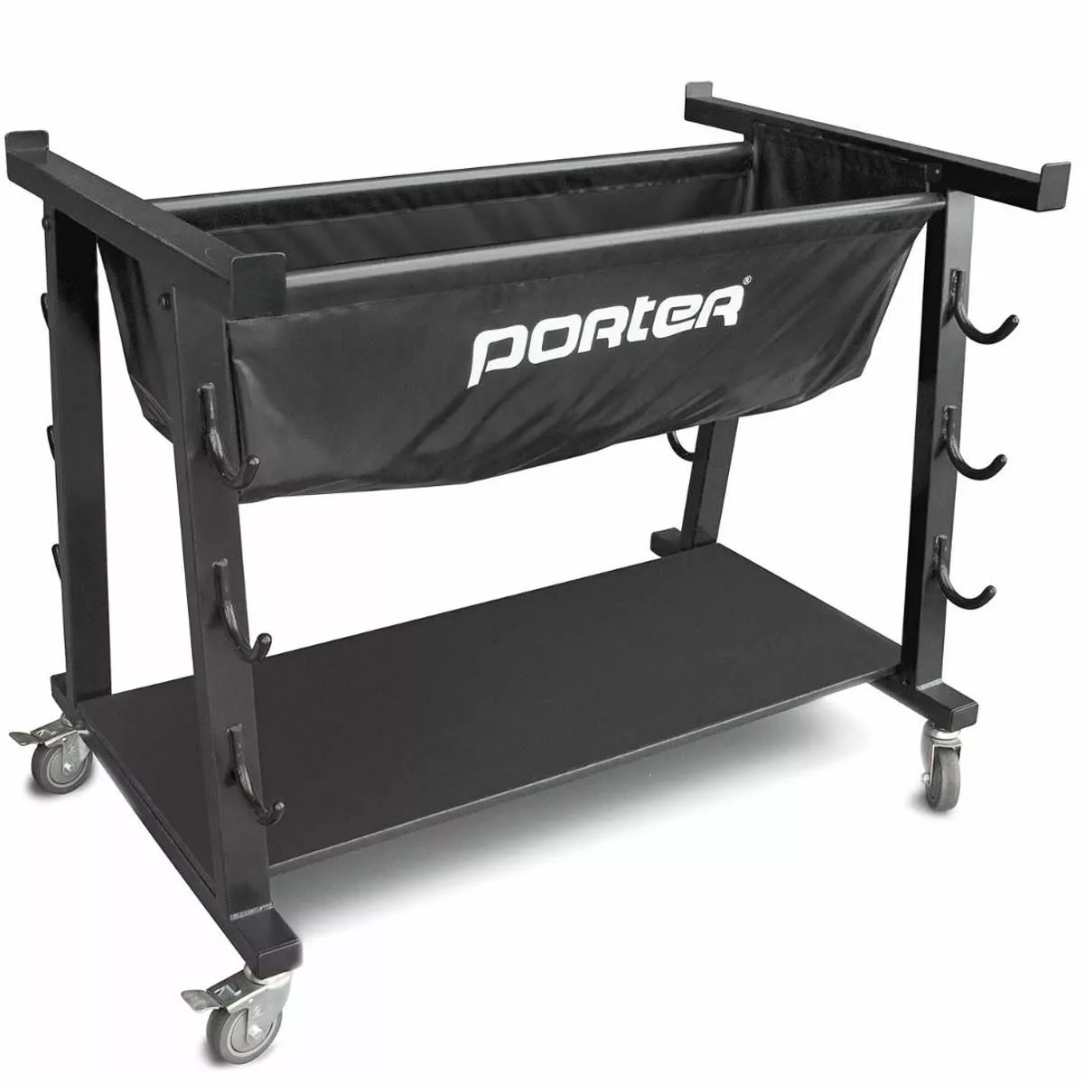 Porter’s volleyball transport system is equipped with proper hardware to store 3 full competition volleyball courts complete with standards, protective pads, nets, judge’s stands and balls. The 3-1/2″ diameter swivel casters make it easy to transport your equipment.