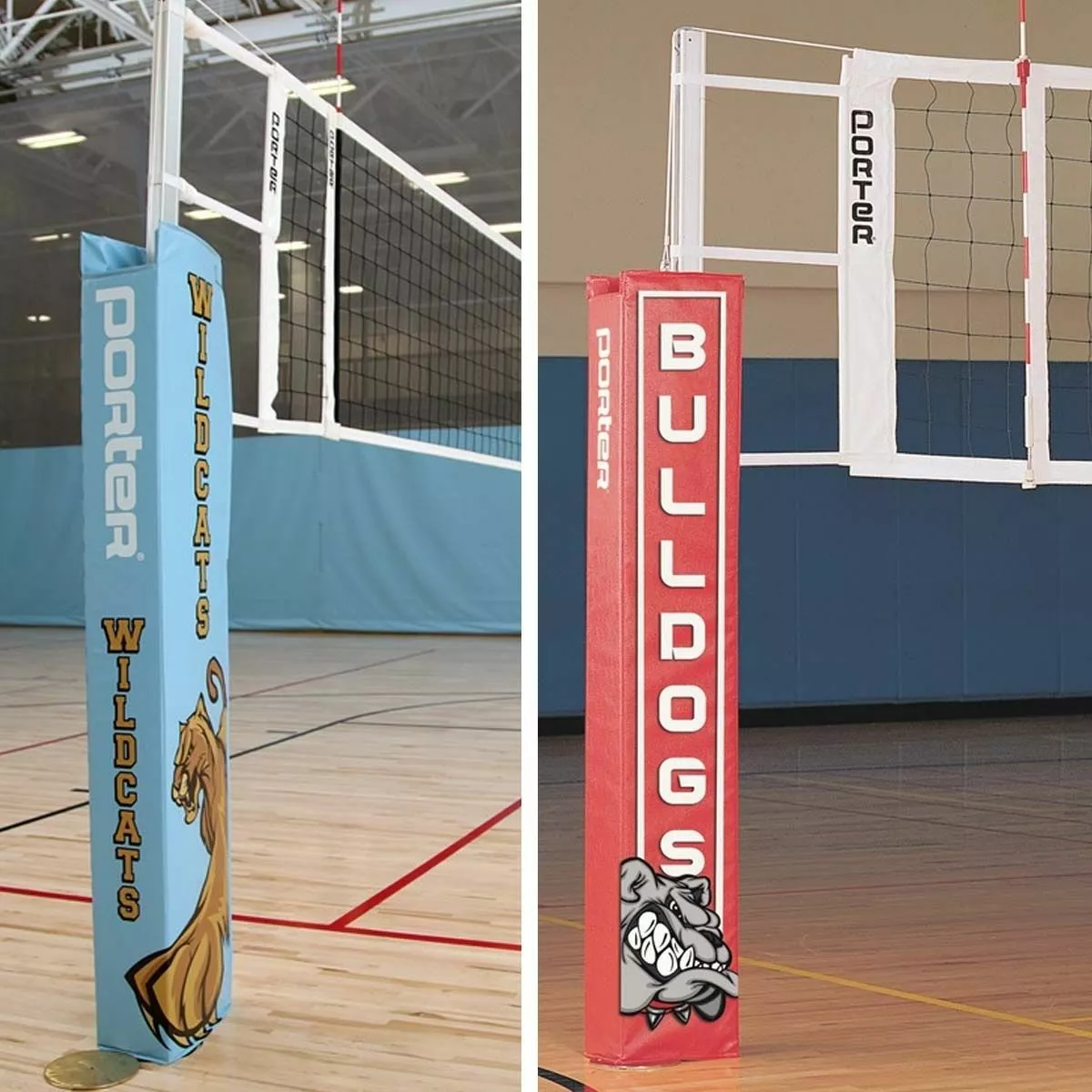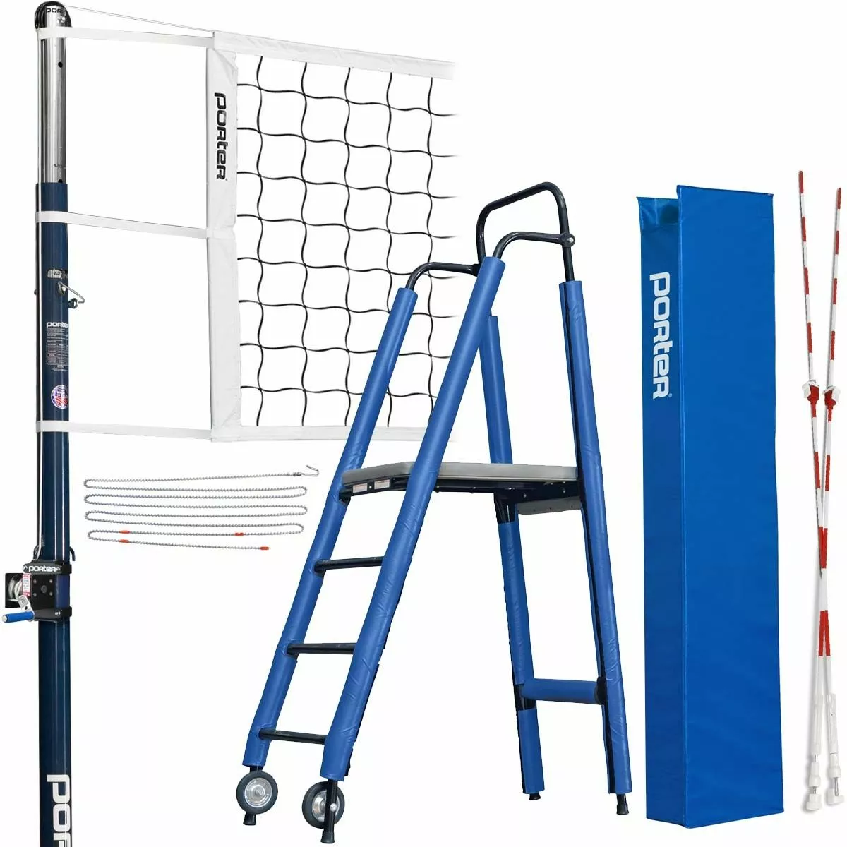 The Powr-Steel international volleyball net package from Porter is built to last with an extremely durable steel frame. This volleyball package includes a free-standing judge stand with stand padding. The 3″ OD steel uprights are sleek, strong, and weigh under 50lbs each. The pair of uprights includes one winch post and one end post. The uprights feature a telescoping design with a high strength pull pin for easy height adjustment to meet all USAV, NCAA and NFHS requirements for competition. A powder coated finish on the bottom part of the upright provides corrosion resistance. A self-locking worm drive prevents net snap back and loss of tension. The bottom of each upright is equipped with an adjustable rubber foot that protects finished floors when moving the standard. This rubber footing can be height adjusted to accommodate ground sleeves that were installed too deeply. The system’s steel infrastructure is built to last with an extremely durable frame and is backed with a lifetime limited warranty. The included upright padding is offered in 14 different colors and can be customized with your team or school logo.