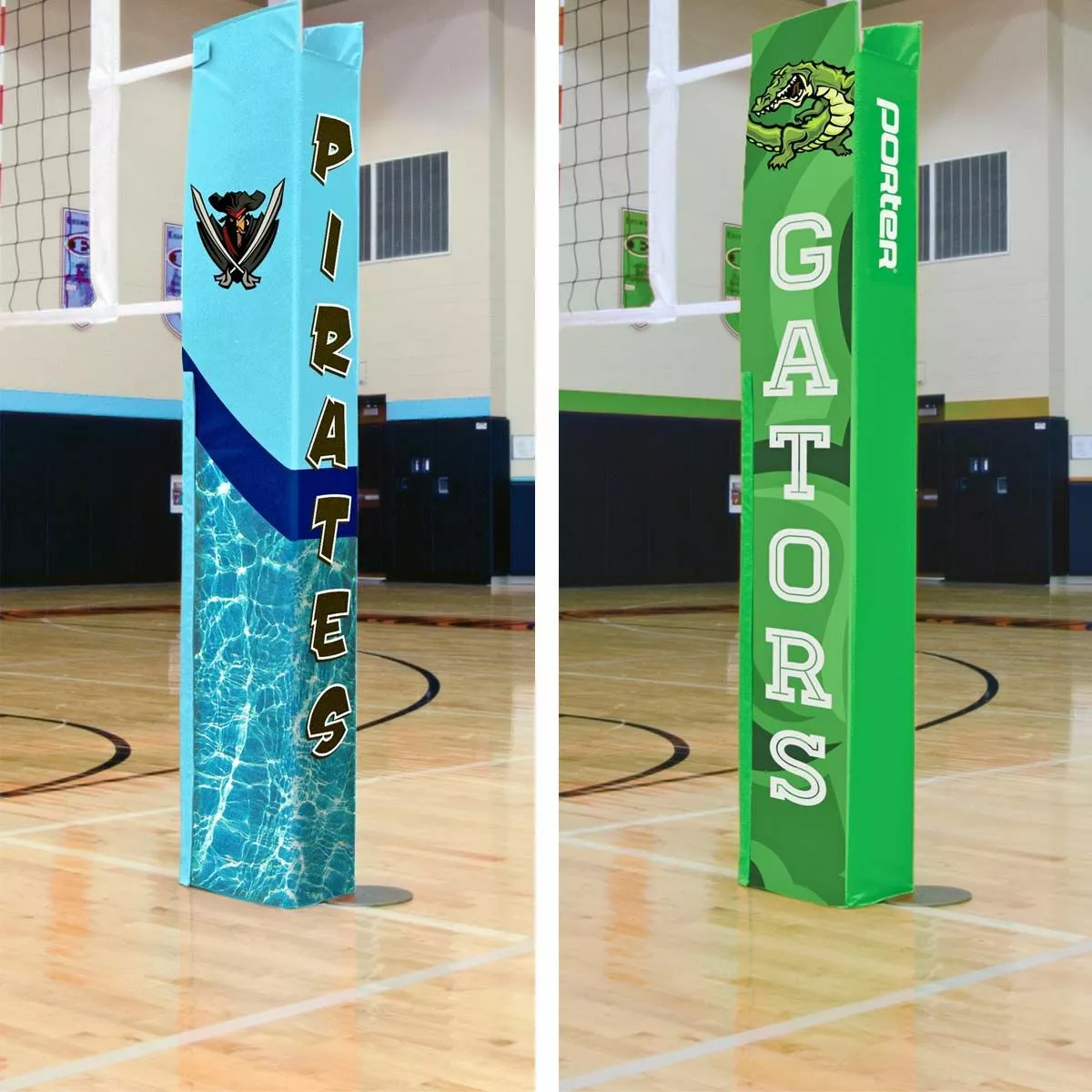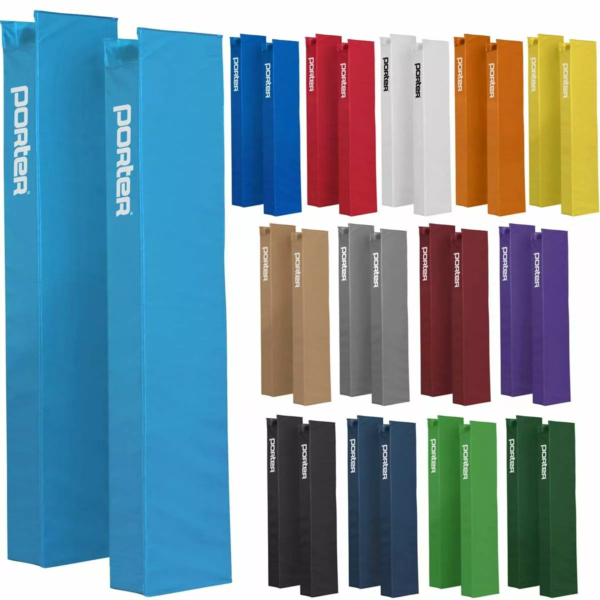 The Powr-Steel standard volleyball net package from Porter is built to last with an extremely durable steel frame. The 3″ OD steel uprights are sleek, strong, and weigh under 50lbs each. The pair of uprights includes one winch post and one end post. The uprights feature a telescoping design with a high strength pull pin for easy height adjustment to meet all USAV, NCAA and NFHS requirements for competition. A powder coated finish on the bottom part of the upright provides corrosion resistance. A self-locking worm drive prevents net snap back and loss of tension. The bottom of each upright is equipped with an adjustable rubber foot that protects finished floors when moving the standard. This rubber footing can be height adjusted to accommodate ground sleeves that were installed too deeply. The Powr-Steel standard package includes upright padding that is offered in 14 different colors and can be customized with your team’s or school’s logo.