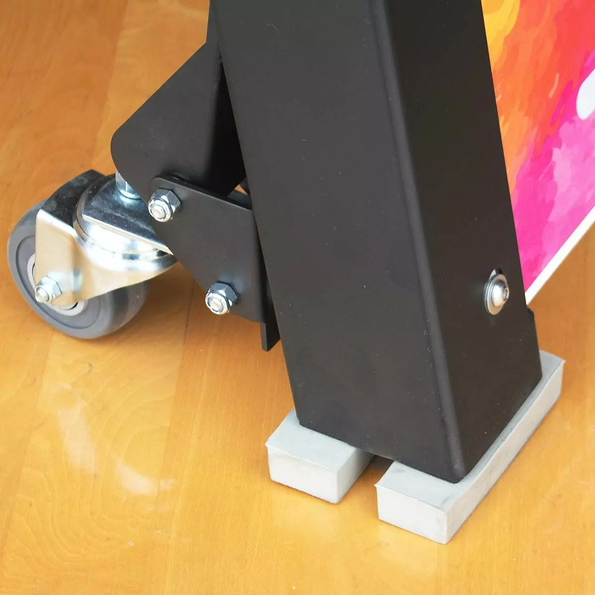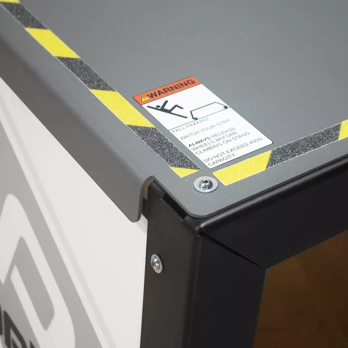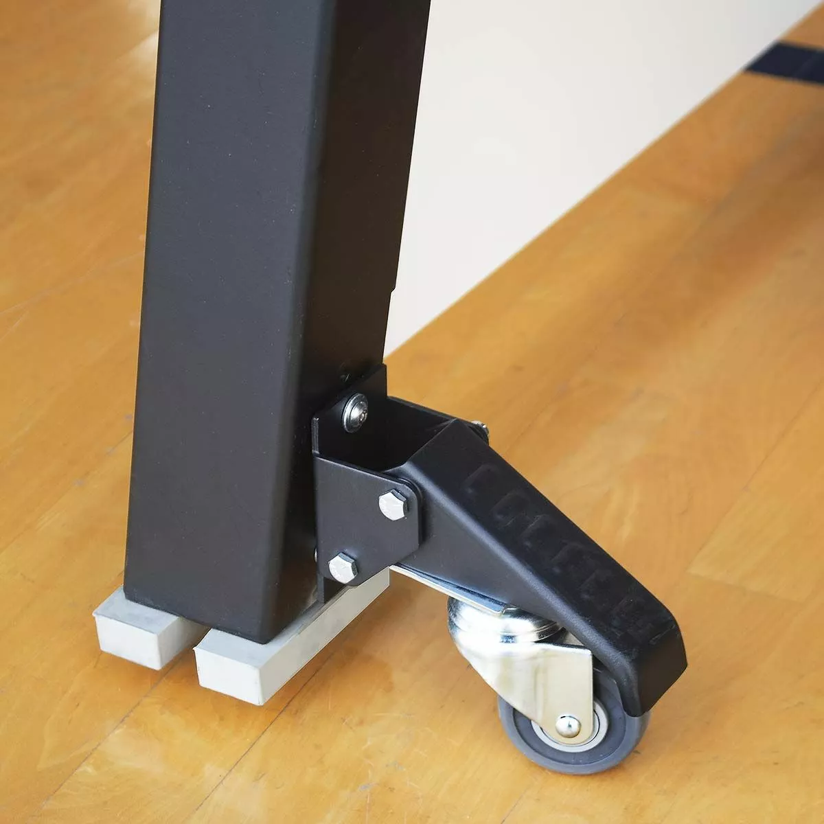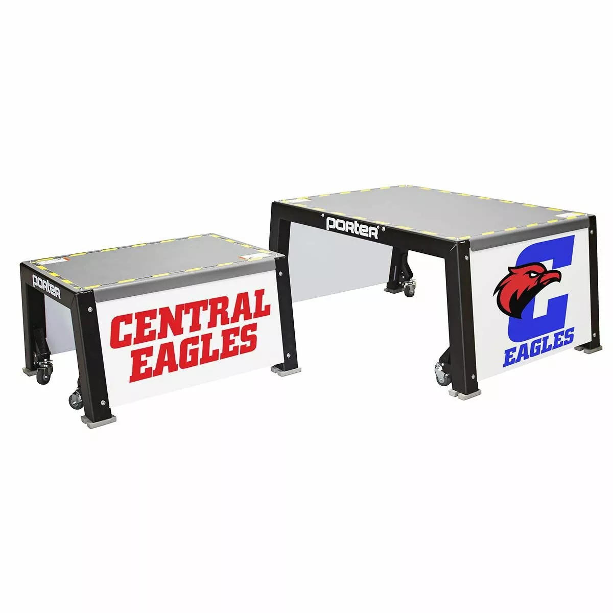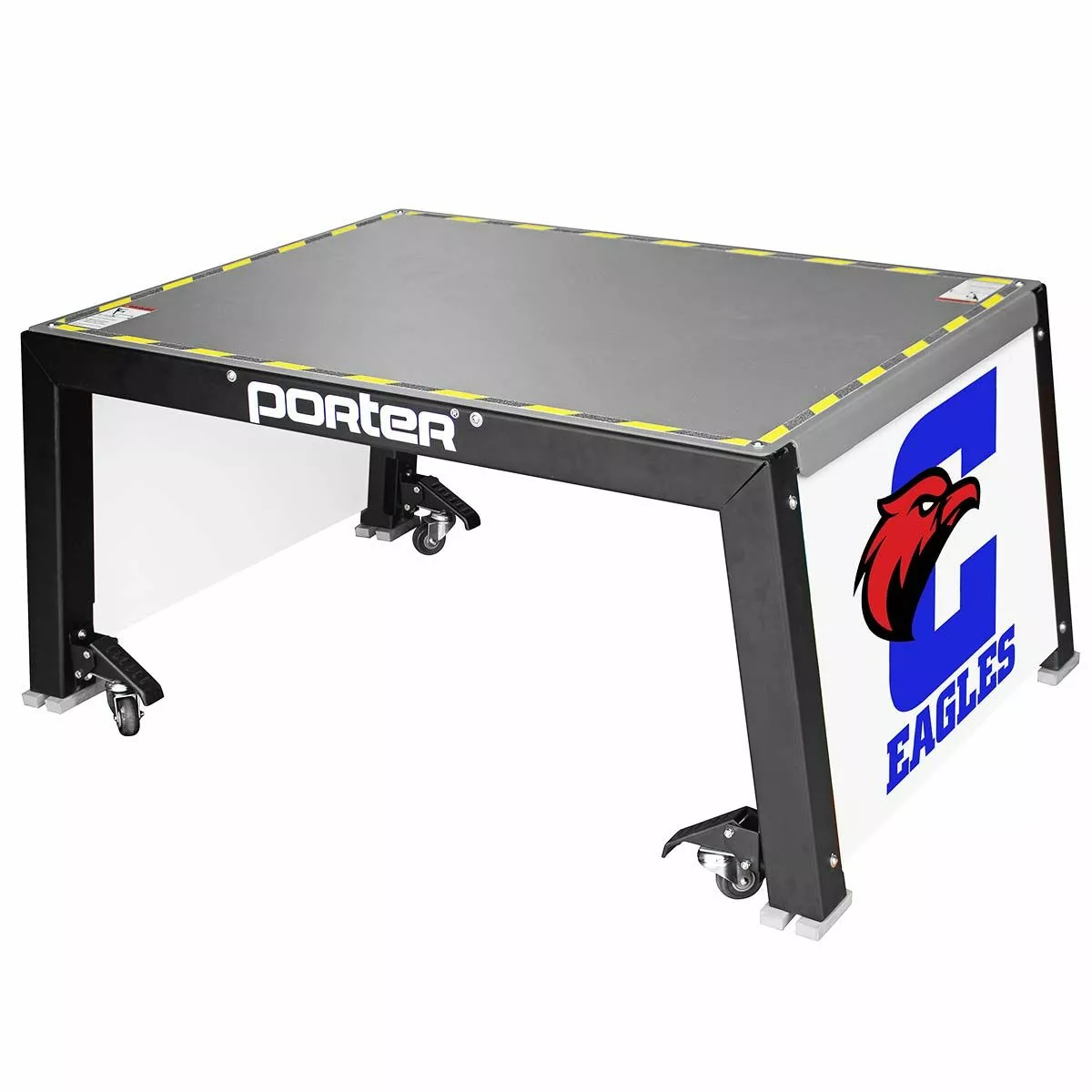 Elevate your training with the Porter volleyball coaches stand. This coach platform allows coaches to run drills from above the net for a more effective training experience. This portable coaches stand can be easily positioned anywhere along the net thanks to four built-in wheel casters. Easy to operate foot levers lock the coaches stand in place while providing quick stop-and-go mobility during practice. Rubber feet prevent any gym floor scratches. The all steel frame provides better stability and safety compared to traditional wood platforms. Add your team or school logo on the graphic side panels at no additional cost.