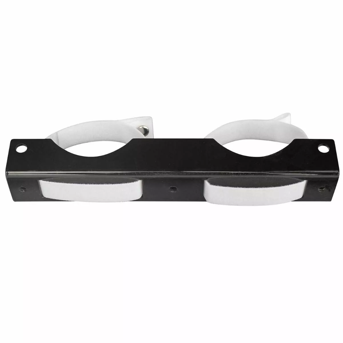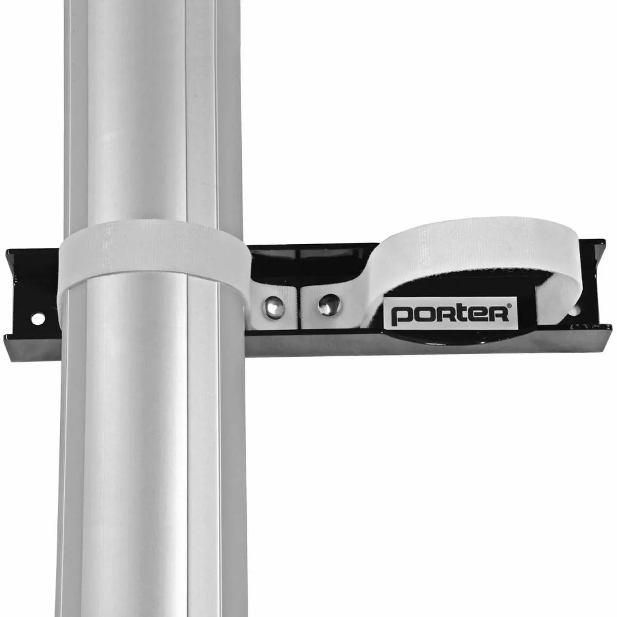 The Porter volleyball standards storage rack provides a convenient method for storing two volleyball standards in a compact space. Each upright is held in place with a hook-and-loop Velcro® closure. This unit ships complete with wall installation hardware.