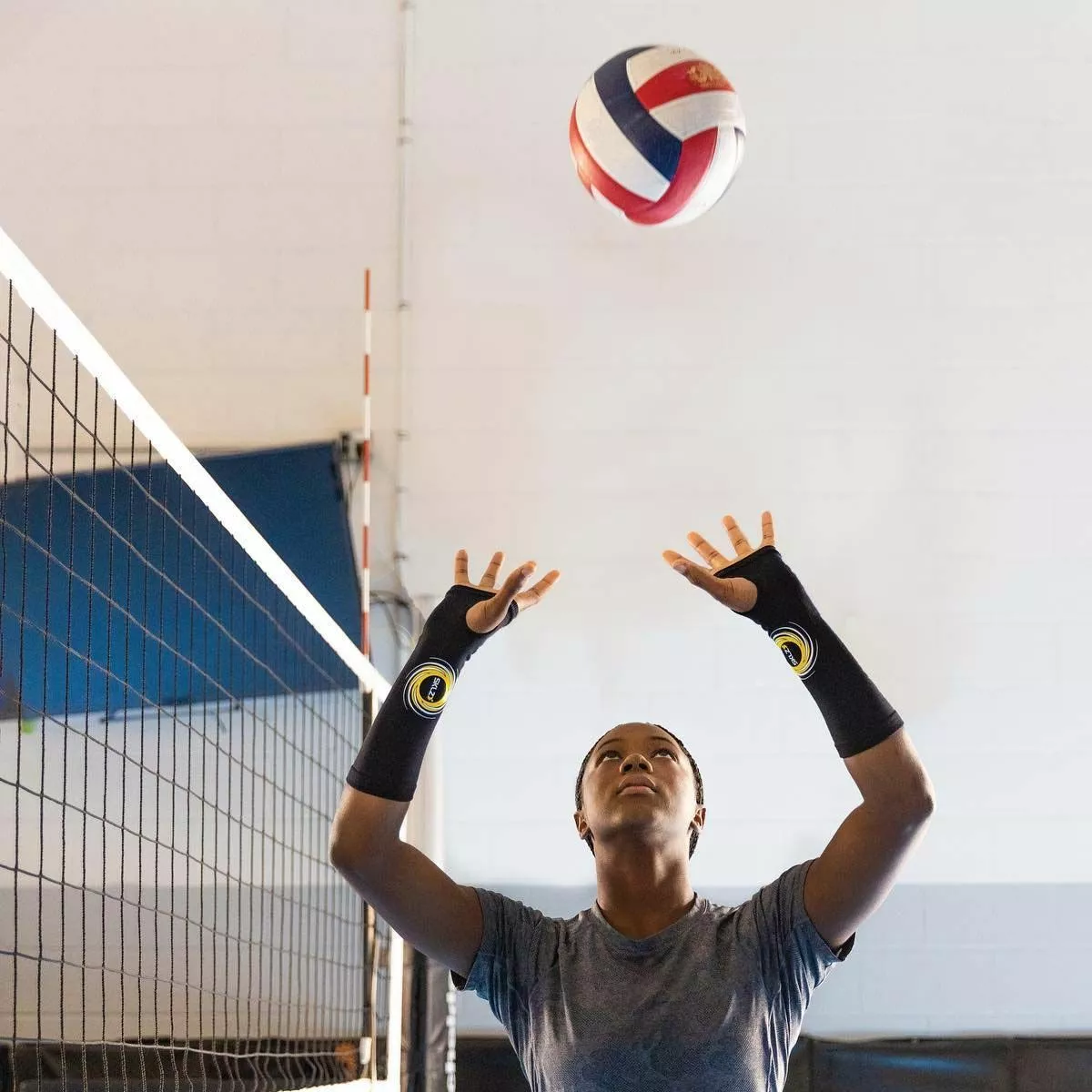 This pair of volleyball digging sleeves by SKLZ are the perfect tool to improve confidence to attack the ball when practicing digging and passing. Built with a breathable and stretchable fabric, these one size fits most sleeves provide protection when making constant ball contact while also helping to reduce floor burns, so athletes can practice worry-free. These volleyball compression training sleeves are designed to keep the hands free when hitting and setting the ball. The sleeves feature thumb loops that keep the sleeves securely in place on the athlete’s arms when practicing digging.