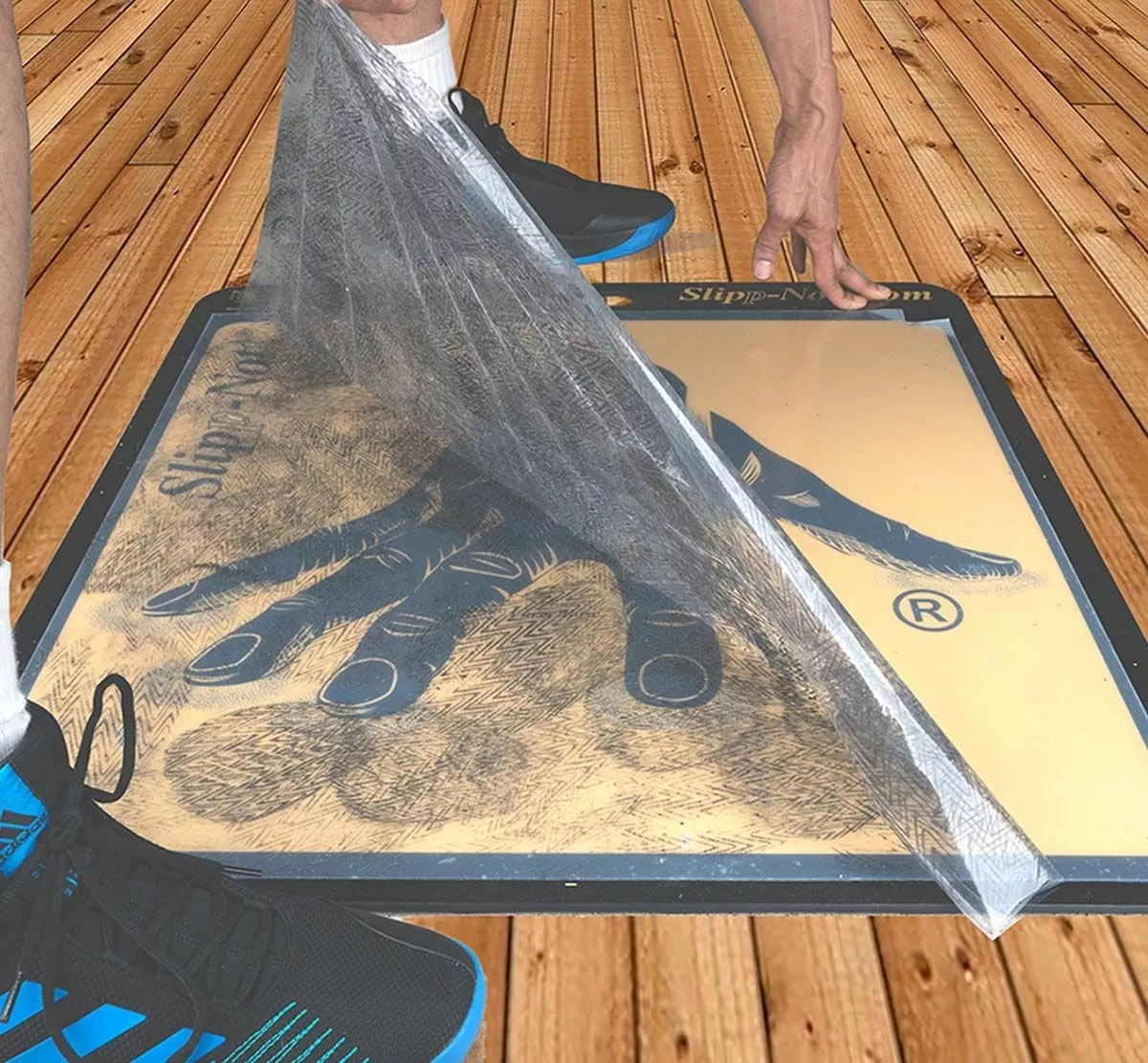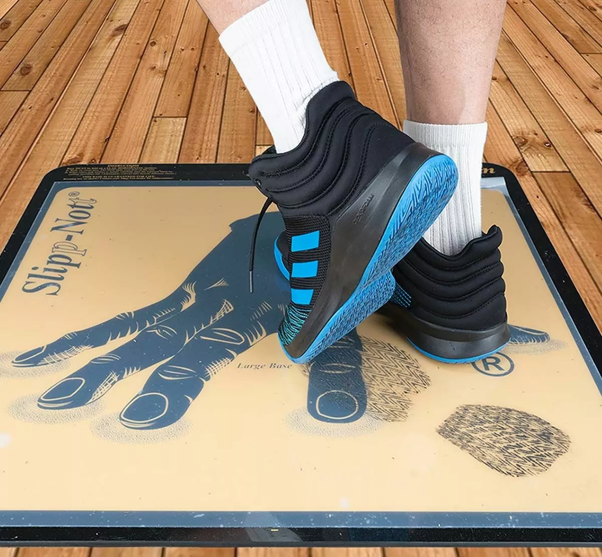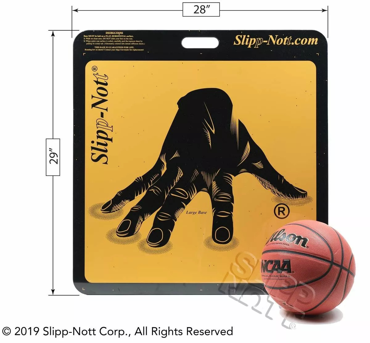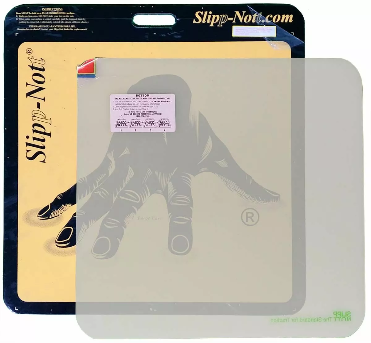 The Slipp-Nott LS60 Sticky Mat Base & Sheets Set (Large) is a shoe traction system that eliminates hand wiping of shoe soles for better traction and less slippage. Great for basketball, volleyball and other indoor sports. Removes dust, dirt and wax build-up from athletic shoe soles with one quick action. Contains one large base and one mat package of 60 sheets. Rip off and discard the sheets as they become soiled. Ribbed rubber bottom for floor protection. For storage, keep the mat flat and out of the sun