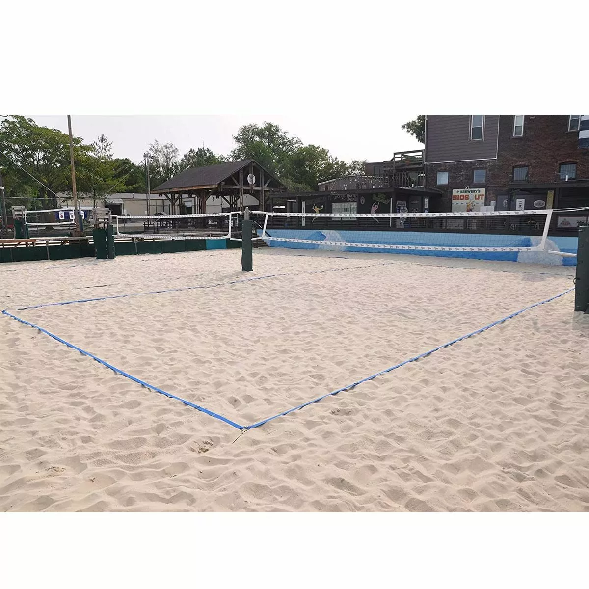 The Tandem adjustable outdoor volleyball court line system allows you to quickly create your own volleyball court on sand or grass. This boundary line system is adjustable to accommodate a regulation size court (30’ x 60’) or a USAV short court (8m x 16m). The adjustable design on the durable 1” nylon lines allows for quick and easy court size modifications. The court line system is offered in blue for easy to see boundaries. This system also includes rope, corner ties, center court marking, heavy-duty plastic corner stakes, and a convenient plastic reel for easy assembly and storage.