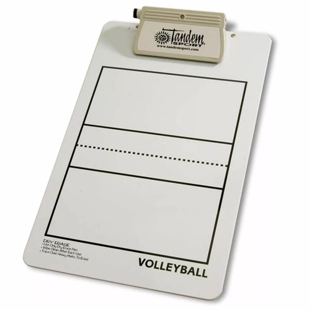 The 9″ x 14″ Tandem coaches’ deluxe volleyball clipboard is a necessity for any volleyball coach. The front of the coaching board includes a volleyball court display, while the opposite side features two rotation locators with substitution and score designations, six court images, and a protective plastic sheet to prevent marker rub off. The included dry erase marker works on both the front and back sides.